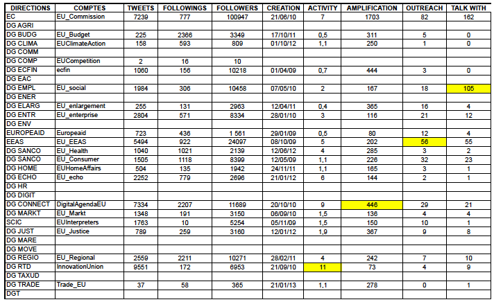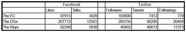- Sur 12 médias sociaux (Facebook en priorité avec 650K fans et 1,8 million en faisant la somme des fans de tous les eurodéputés), le PE est actif pour sensibiliser à ses activités et favoriser la participation des citoyens ;